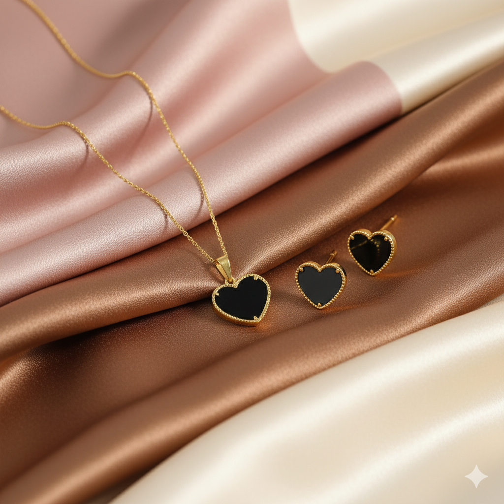 O Conjunto Coração Ônix é a perfeita tradução de elegância e intensidade. O design em formato de coração, símbolo universal do amor, ganha sofisticação com o banho em ouro 18K que emoldura o fundo preto intenso, remetendo ao charme atemporal da pedra ônix.
