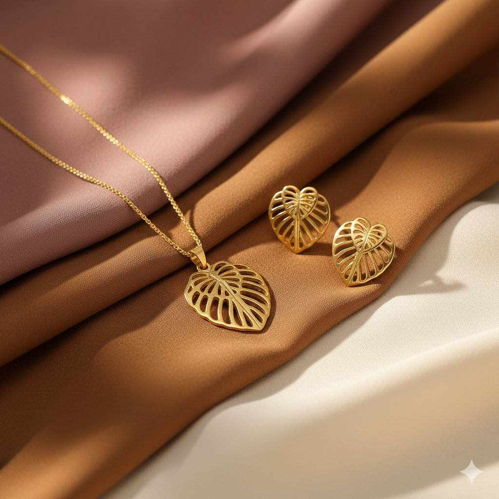 O Conjunto Folha Tropical Banhado a Ouro 18K é uma celebração à beleza natural e à leveza da vida. Inspirado nas formas orgânicas das folhas tropicais, o design vazado e delicado traduz elegância, frescor e uma conexão genuína com a natureza.